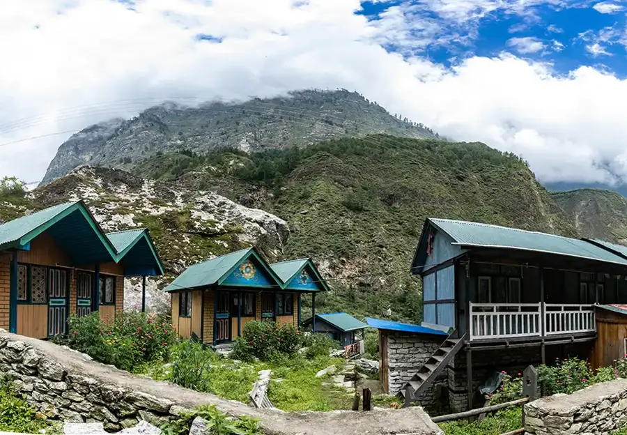 Pass by old landslide zones slowly returning to green and enjoy the rugged terrain in the thinning mountain air. Take it slow, especially on steep sections. By evening, you'll reach the peaceful hamlet of Chhokang, where you’ll settle in for the night.