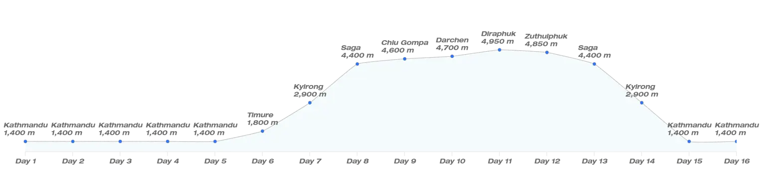 The tour begins in Kathmandu, a land of ancient traditions and spiritual blessings. Leaving Kathmandu behind, you will notice the landscape transform into higher hills, providing occasional glimpses of the majestic Himalayan peaks. These are the same peaks that guard the sacred lands of Kailash and Mansarovar in the plateau of Tibet. We come to the end of the long and winding road in Kerung, our gateway into Tibet past Nepal. The spiritual path ahead calls us, once we cross Rasuwagadhi, the border village of Nepal and Tibet. Entering Tibet, we will immediately see a land apart — the Tibetan plateau stretching before us, vast and austere. Its stark but sublime beauty at the roof of the world is, although not nefarious, felt via the thinness of air that seems to be carrying dim whispers of ancient pilgrims — in this ancient route of yore.