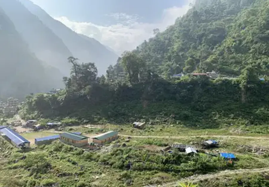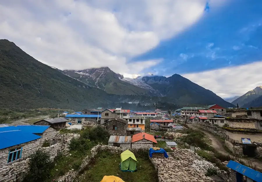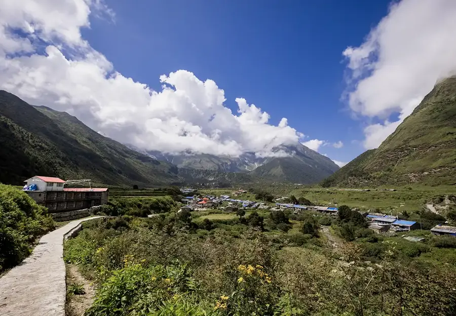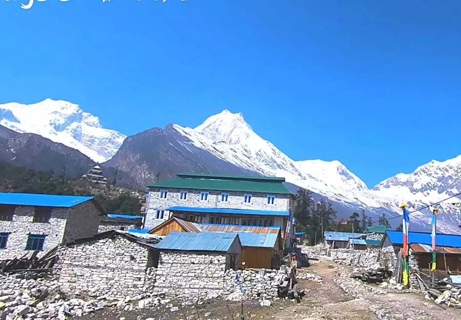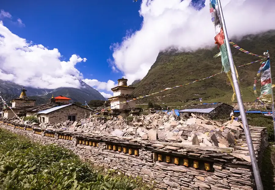 The scenic route has enchanting views of Ganesh Himal and Shringi Himal. Trekking further, you will arrive at an impressive mani wall. This is the village of Lho, where you will spend the night.