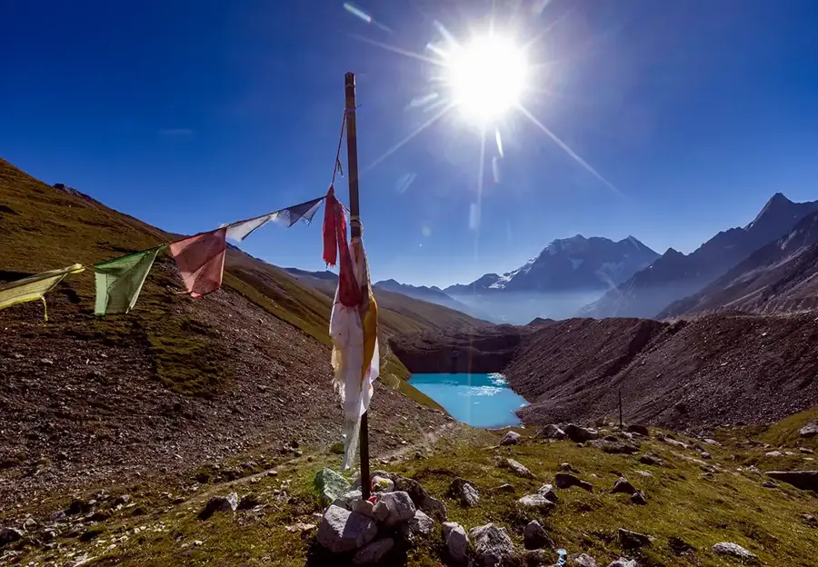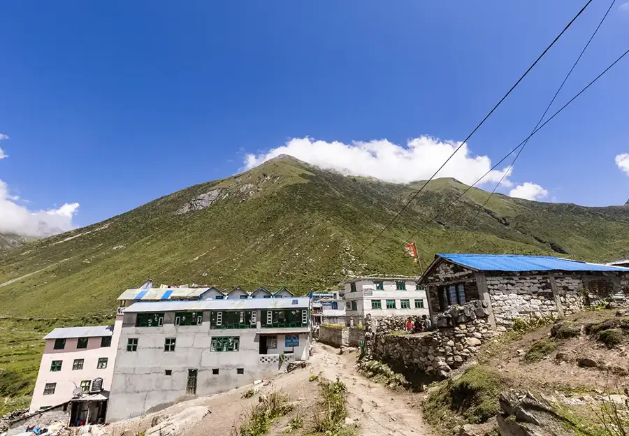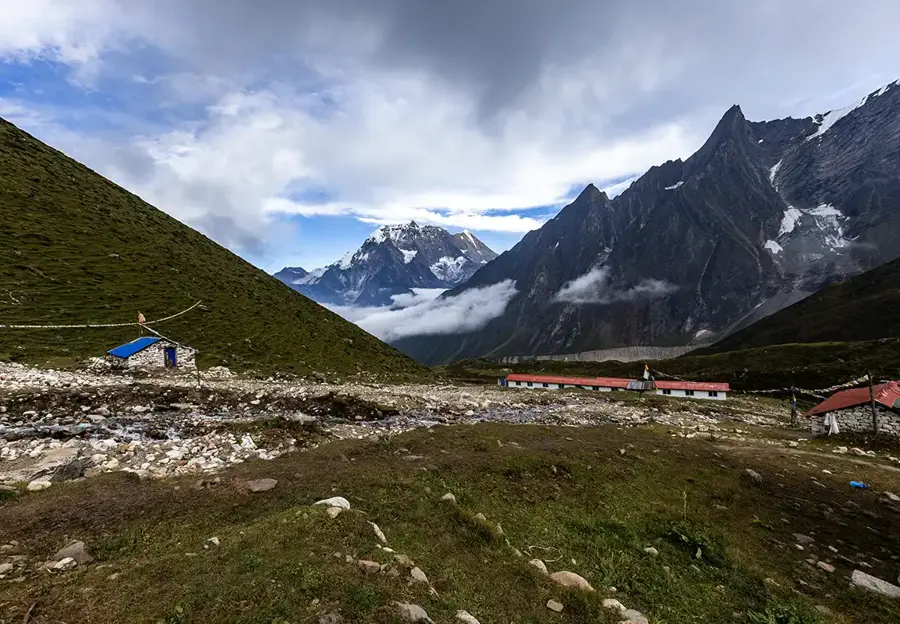 Set off from Bimthang after breakfast, following views of stunning sunrise over the majestic Cheo, Himlung, Lamjung, and Manaslu peaks. The challenging trail descends along a ridge, so tread carefully.
