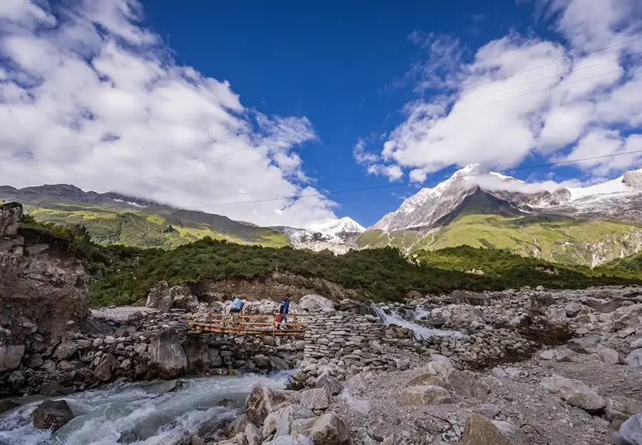 You cross Budhi Gandaki River several times on suspension bridges, and enjoy stunning views of several majestic peaks of the Manaslu region. Crossing the villages of Rana and Ghap, you will come to carved mani stones depicting Tibetan culture.